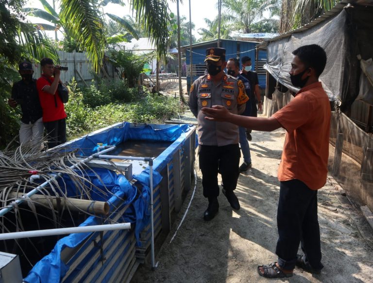 BATUBARA–Kapolres Batubara AKBP Ikhwan Lubis mengunjungi pengelolaan limbah milik Untung (35) yang membawa keberuntungan masyarakat kepada masyarakat di Desa Kuala Tanjung, Kecamatan Sei Suka, Batubara, Rabu (15/9/2021).