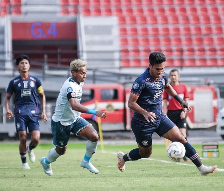 Pemain Arema FC ditempel pemain Persita Tangerang pada laga pekan ke-12 Liga 1 Indonesia 2023/2024 dengan skor akhir imbang 0-0 di Stadion Kapten I Wayan Dipta, Kabupaten Gianyar, Bali, Sabtu (16/9/2023) (Instagram @aremafc)