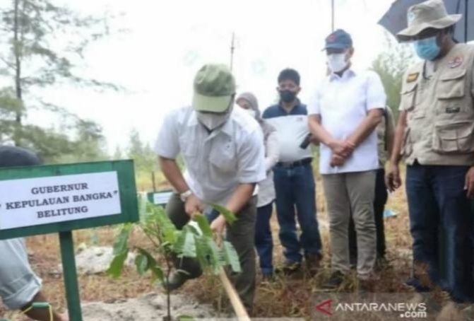 PANGKAL PINANG – Komisaris Utama PT Indonesia Asahan Alumunium (Inalum) Letnan Jenderal (Letjen) TNI (Purn) Doni Monardo meninjau sekaligus menanam pohon di lahan bekas tambang bijih timah di Kabupaten Bangka, Provinsi Kepulauan Bangka Belitung (Babel).