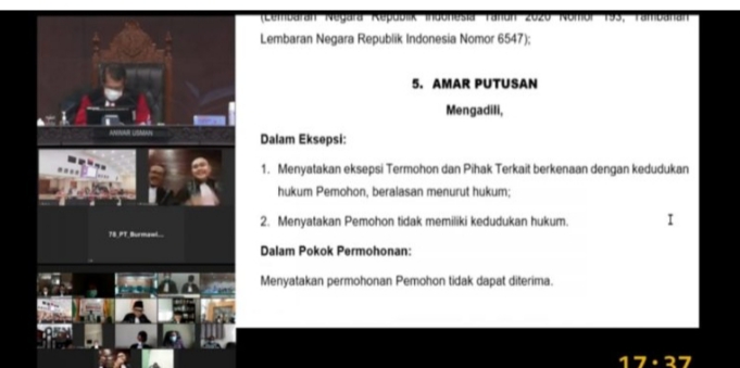“Menyatakan permohonan pemohon tidak dapat diterima,” demikian kutipan amar putusan yang dibacakan Hakim Mahkamah Konstitusi, dalam sidang pembacaan putusan yang digelar Selasa (16/2/2021) sore.