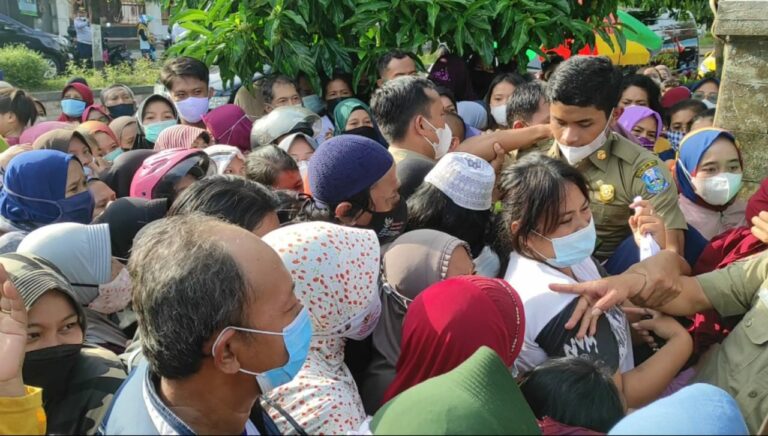 MAGETAN–Ribuan warga Kabupaten Magetan Jawa Timur, menyerbu Kantor UPT Bapenda Jatim, Kabupaten Magetan, untuk mendapatkan minyak goreng murah, Selasa (15/2/2022).