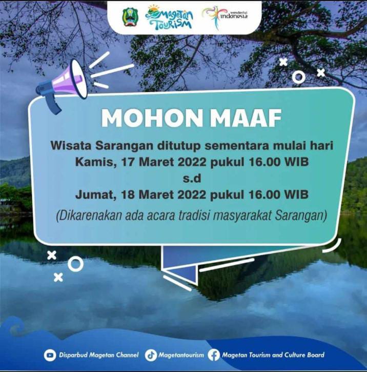 Saat dikonfirmasi Kepala Dinas Pariwisata dan Kebudayaan (Disparbud) Magetan Joko Trihono membenarkan, bahwa objek wisata Telaga Sarang ditutup sementara selama 2 hari kedepan.