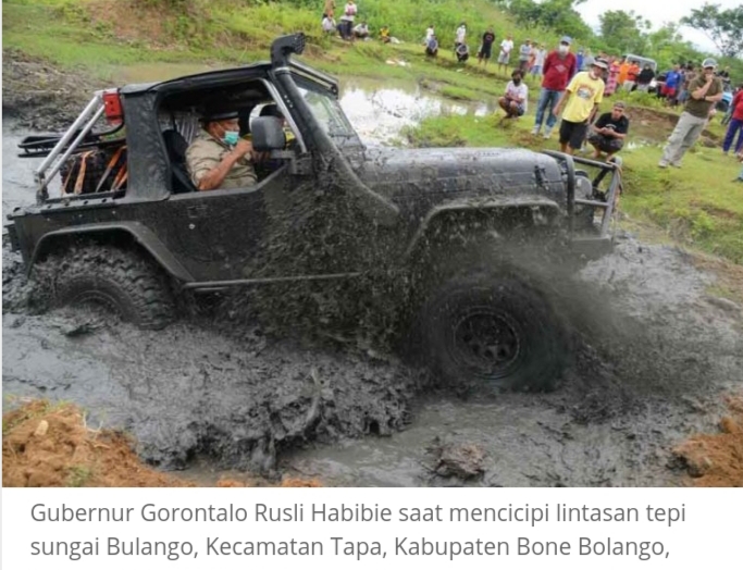 Baru beberapa menit turun main, mobil black satin yang dikendarai Ketua IOF Gorontalo Rusli Habibie, yang juga menjabat sebagai Gubernur Gorontalo sudah dibuat susah payah. Kubangan air berlumpur membuat kendaraannya terperosok tidak berkutik.