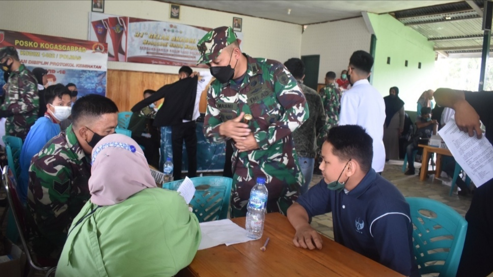 Beberapa anggota TNI yan memiliki kualifikasi kesehatan, terlibat bersama tim vaksinator dan tim tenaga kesehatan Rumkitban Polman.