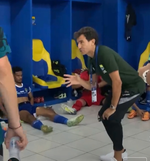 Pelatih Luis Milla menyemangati para pemain Persib di ruang ganti. (Persib.co.id)