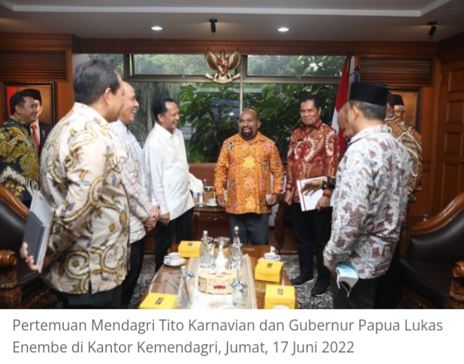 JAKARTA–Menteri Dalam Negeri (Mendagri) M Tito Karnavian bersama Gubernur Papua, Lukas Enembe, SIP, MH, menyepakati rencana pemekaran tujuh provinsi di Tanah Papua sesuai dengan wilayah adat.