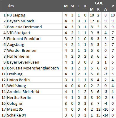 JAKARTA – RB Leipzig masih berada di posisi teratas klasemen Liga Jerman, ketika Bayern Munich dan Borussia Dortmund menempel ketat, setelah ketiganya memainkan pertandingan-pertandingan putaran keempat, Sabtu setempat atau Minggu dini hari WIB.