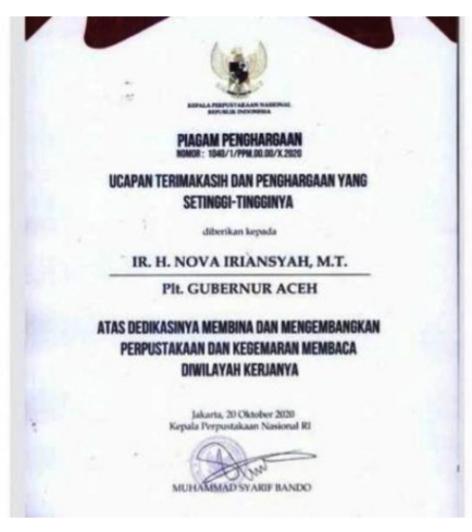 BANDA ACEH – Perpustakaan Nasional (Perpusnas) Indonesia menganugerahkan penghargaan kepada Gubernur Aceh, Nova Iriansyah. Nova dinilai memiliki dedikasi dalam membina, mengembangkan perpustakaan, dan menumbuhkan kegemaran membaca di Aceh.