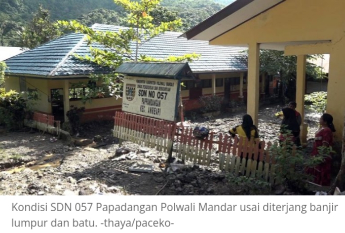 POLMAN–Bangunan Sekolah Dasar Negeri (057) Desa Pappandangan, Kecamatan Anreapi, Kabupaten Polewali Mandar, Sulawesi Barat, diterjang Banjir luapan sungai. Murid terpaksa diliburkan, karena hampir semua ruangan di sekolah ini dipenuhi lumpur hingga tidak dapat difungsikan. Salah satu ruangan kondisinya rusak parah dipenuhi bebatuan.