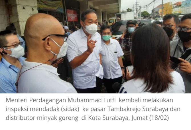 SURABAYA– Menteri Perdagangan Muhammad Lutfi kembali melakukan inspeksi mendadak (sidak) ke pasar dan distributor minyak goreng, di Surabaya, Jumat (18/2/2022).