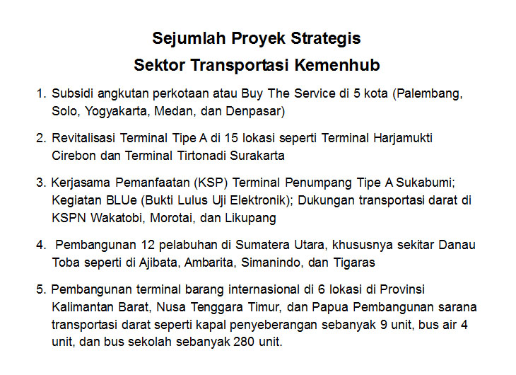 Menurutnya sejumlah proyek strategis di sektor transportasi tengah dan akan dikerjakan Kemenhub melalui Ditjen Perhubungan Darat yaitu : Subsidi angkutan perkotaan atau Buy The Service di 5 kota (Palembang, Solo, Yogyakarta, Medan, dan Denpasar); Revitalisasi beberapa Terminal Tipe A di 15 lokasi seperti Terminal Harjamukti Cirebon dan Terminal Tirtonadi Surakarta; Kerjasama Pemanfaatan (KSP) Terminal Penumpang Tipe A Sukabumi; Kegiatan BLUe (Bukti Lulus Uji Elektronik); Dukungan transportasi darat di KSPN Wakatobi, Morotai, dan Likupang; Pembangunan 12 pelabuhan di Sumatera Utara, khususnya sekitar Danau Toba seperti di Ajibata, Ambarita, Simanindo, dan Tigaras; Pembangunan terminal barang internasional di 6 lokasi di Provinsi Kalimantan Barat, Nusa Tenggara Timur, dan Papua; dan Pembangunan sejumlah sarana transportasi darat seperti kapal penyeberangan sebanyak 9 unit, bus air 4 unit, dan bus sekolah sebanyak 280 unit.