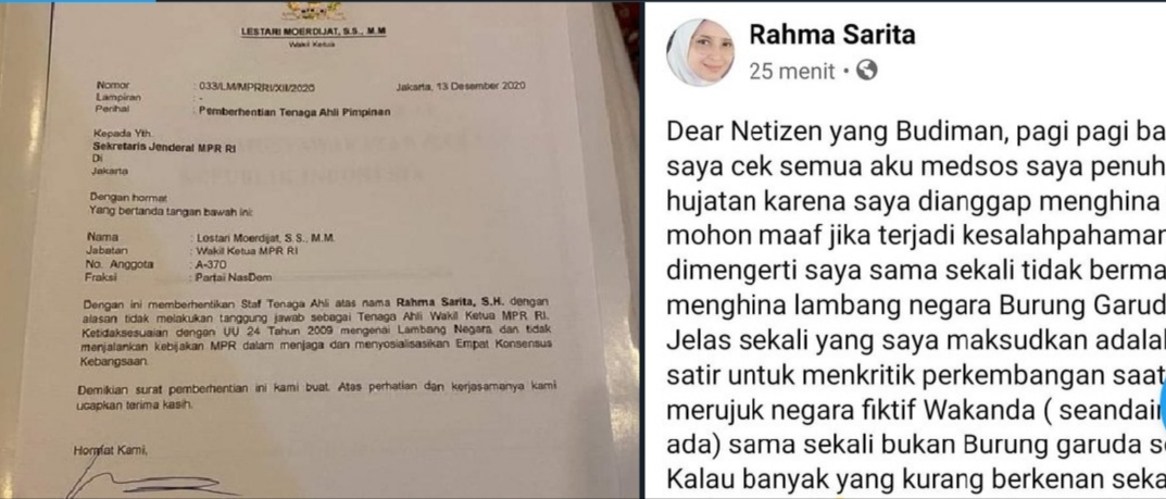 Buntutnya, Wakil Ketua MPR itu mengirim surat ke Sekretariat Jenderal MPR RI, mengajukan pemberhentian Rahma Sarita. Surat ini pun lantas beredar di media sosal, bersanding dengan tangkapan layar unggahan Rahma.