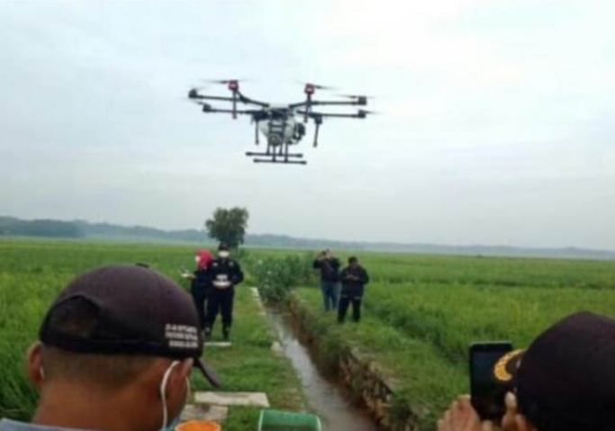 Adalah Dinas Pertanian Kabupaten Bekasi memanfaatkan teknologi benda terbang ini untuk menyemprot hama wereng.
