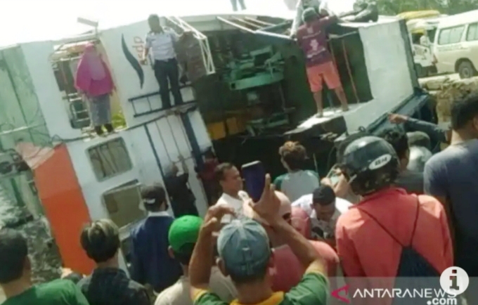 Puluhan penumpang terjatuh ke lait. Tim SAR gabungan dikerahkan ke lokasi untuk mencari ada tidaknya korban yang terjebak di kapal.