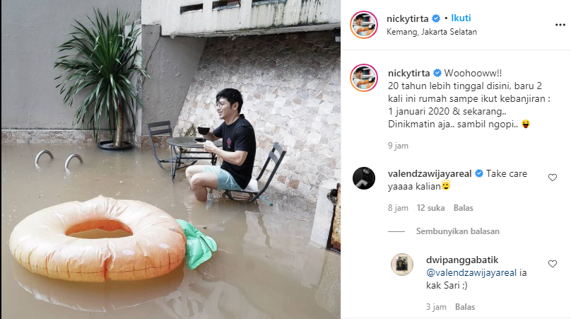 “20 tahun tinggal di sini, baru 2 kali ini kebanjiran. 1 Januari 2020 dan sekarang,” tulis Nicky Tirta di akun Instagram pribadi, Sabtu (20/2/2021).