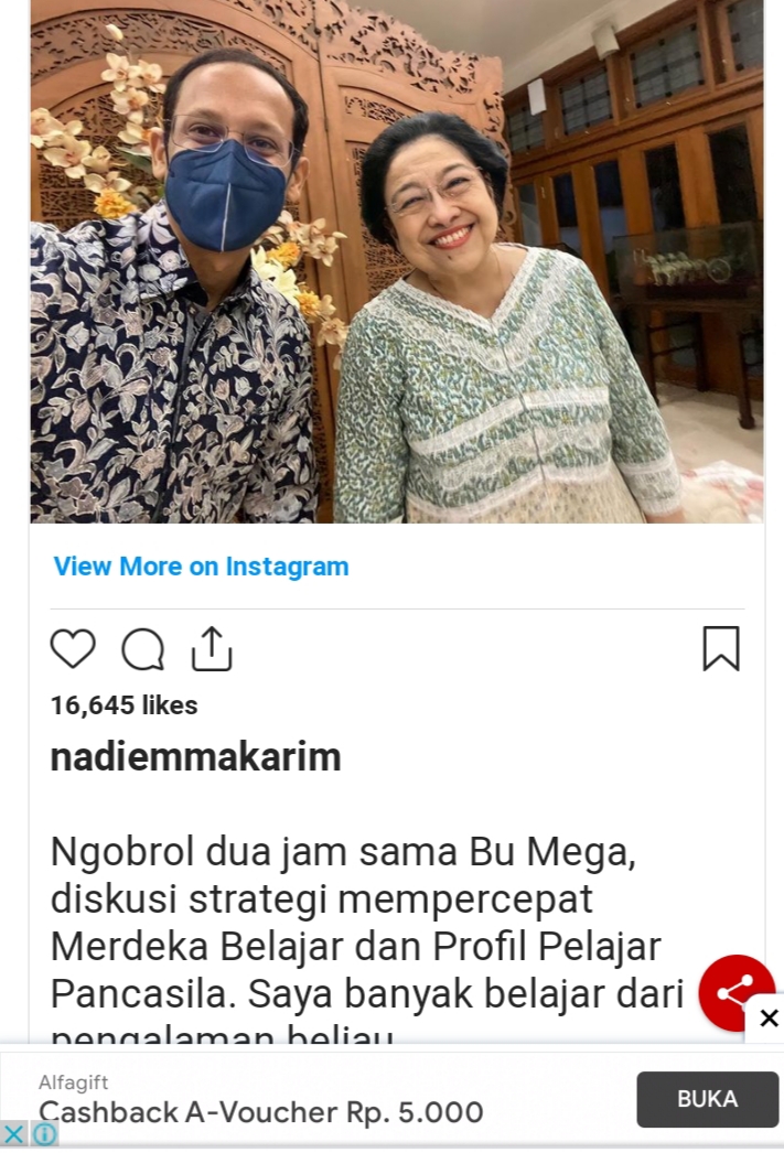 “Ngobrol dua jam sama Bu Mega, diskusi strategi mempercepat Merdeka Belajar dan profil Pelajar Pancasila. Saya banyak belajar dari pengalaman beliau,” tulis Nadiem memberi keterangan swafotonya dengan Mega.
