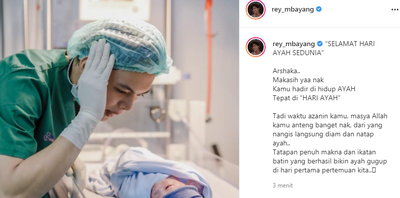 “SELAMAT HARI AYAH SEDUNIA. Arshaka. Makasih yaa nak. Kamu hadir di hidup AYAH. Tepat di “HARI AYAH’. Tadi waktu azanin kamu, masya Allah kamu anteng banget nak, dari yang nangis langsung diam dan natap ayah. Tatapan penuh makna dan ikatan batin yang berhasil bikin ayah gugup di hari pertama pertemuan kita, tulis Rey. (ben)