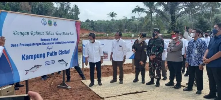 LEBAK–Menteri Kelautan dan Perikanan RI Sakti Wahyu Trenggono meresmikan Kampung Patin Cisilad di Kampung Cisilad, Desa Prabugantungan, Kecamatan Cileles, Kabupaten Lebak, Kamis (19/82021).