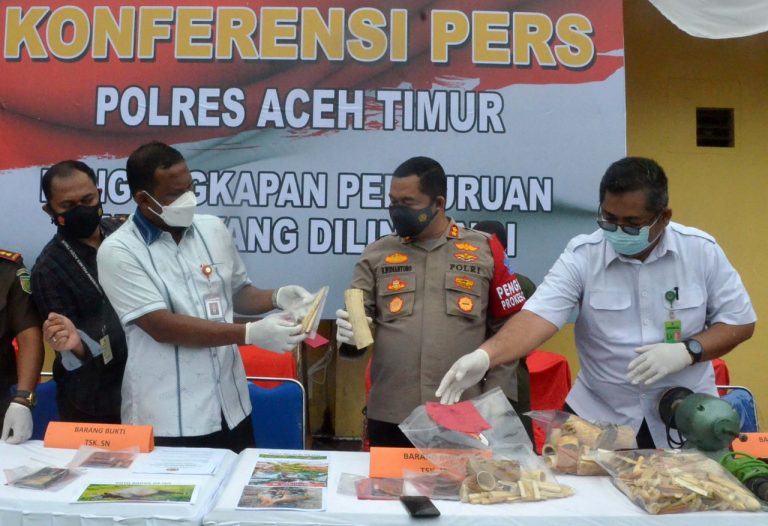 IDI–Kepolisian Resor (Polres) Aceh Timur membekuk lima sindikat perdagangan satwa liar dilindungi antar provinsi di sejumlah lokasi, baik di Aceh dan Pulau Jawa. Kelimanya dinilai terlibat dalam aksi pembunuhan gajah di area HGU PT Bumi Flora, Desa Jambo Reuhat, Banda Alam, Aceh Timur, Sabtu (10/7/2021) lalu.