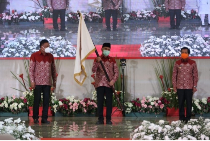 BABEL–Wakil Gubernur Kepulauan Bangka Belitung Abdul Fatah menerima Bendera Pataka Hari Kesetiakawanan Sosial Nasional (HKSN) sebagai tanda Provinsi Kepulauan Bangka Belitung menjadi Tuan Rumah Peringatan Puncak Hari Kesetiakawanan Sosial Nasional tahun depan.