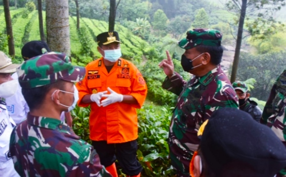 Wagub Uu bersama Pangdam III/Siliwangi Nugroho Budi Wiryanto didampingi Bupati Bogor Ade Yasin meninjau korban Banjir bandang di Kampung Gunung Mas Desa Tugu Selatan Kecamatan Cisarua Kabupaten Bogor, Rabu (20/1/2021).