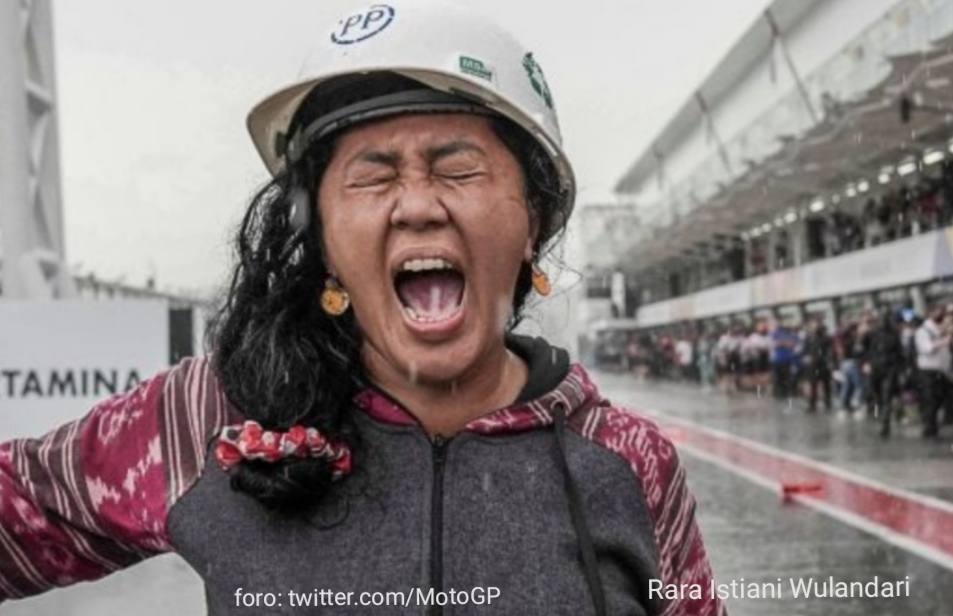 Media asing dan akun resmi MotoGP bahkan memuji dan berterima kasih atas usaha Rara menangkal hujan.