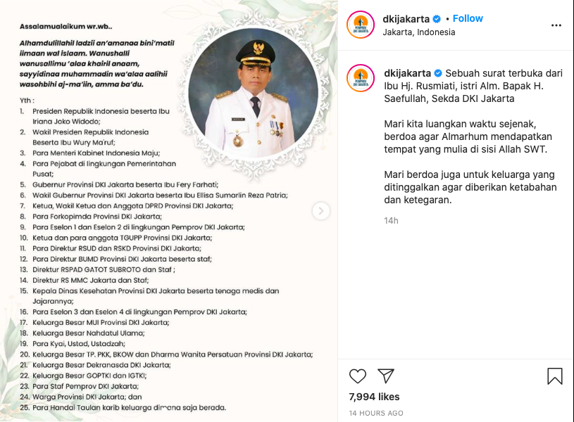 JAKARTA – Pemprov DKI Jakarta melalui akun Instagram mengunggah surat terbuka yang ditulis oleh Istri mendiang Sekretaris Daerah DKI Jakarta Saefullah, Rusmiati, Senin (21/9/2020).