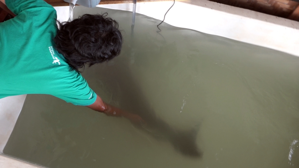 Berdasarkan pantauan wartawan, saat ini bayi dugong dimasukkan ke dalam bak fiber sepanjang dua meter dan lebar 1,5 meter. Sebelumnya, bak tersebut telah diisi air laut.