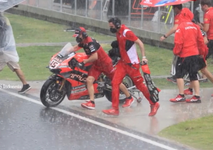 LOMBOK–Start balapan kedua World Superbike di Sirkuit Pertamina Mandalika ditunda menyusul hujan deras pada Minggu sore.