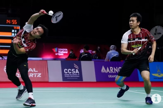 BANGKOK–Ganda putra Indonesia Hendra Setiawan/Mohamad Ahsan merangsek ke babak semifinal Thailand Open 2021 setelah menyingkirkan pasangan wakil Inggris Ben Lane/Sean Vendy dengan dua gim langsung 21-14, 21-13 di babak delapan besar.