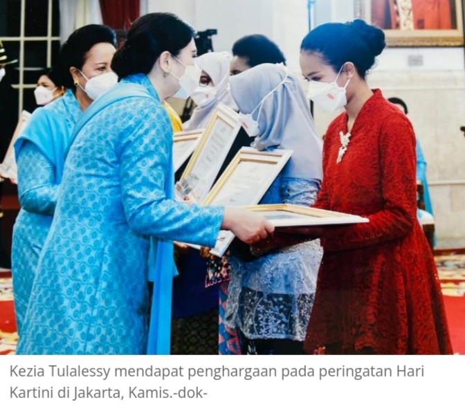 AMBON–Kezia Arabelle Tulalessy (16) menjadi wakil kota Ambon penerima penghargaan Perempuan berjasa dan berprestasi bidang lingkungan hidup pada puncak Peringatan Hari Kartini Tahun 2022 di Istana Negara.