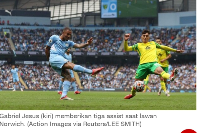 Gabriel Jesus kembali jadi aktor gol keempat tuan rumah ke gawang Norwich. Dari kaki kanan Jesus, Raheem Sterling membawa Man City unggul 4-0 atas Norwich pada menit ke-71.