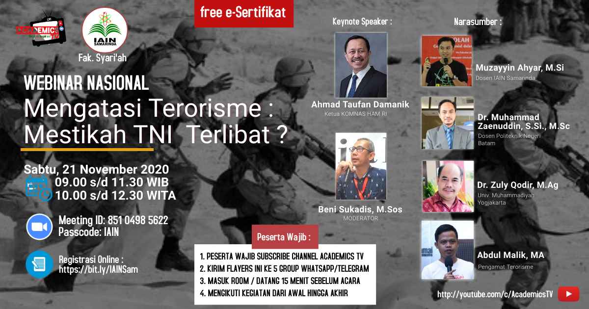 SAMARINDA – Adanya usulan dan wacana akan dilibatkannya TNI dalam penumpasan terorisme di Indonesia, memantik ragam pendapat. Guna menyelaraskan itu, Academics TV bekerja sama dengan Fakultas Syariah IAIN Samarinda, Kalimantan Timur, menggelar webinar nasional, Sabtu (21/11/2020), dengan mengangkat tema ‘Mengatasi Terorisme, Mestikah TNI Terlibat?’