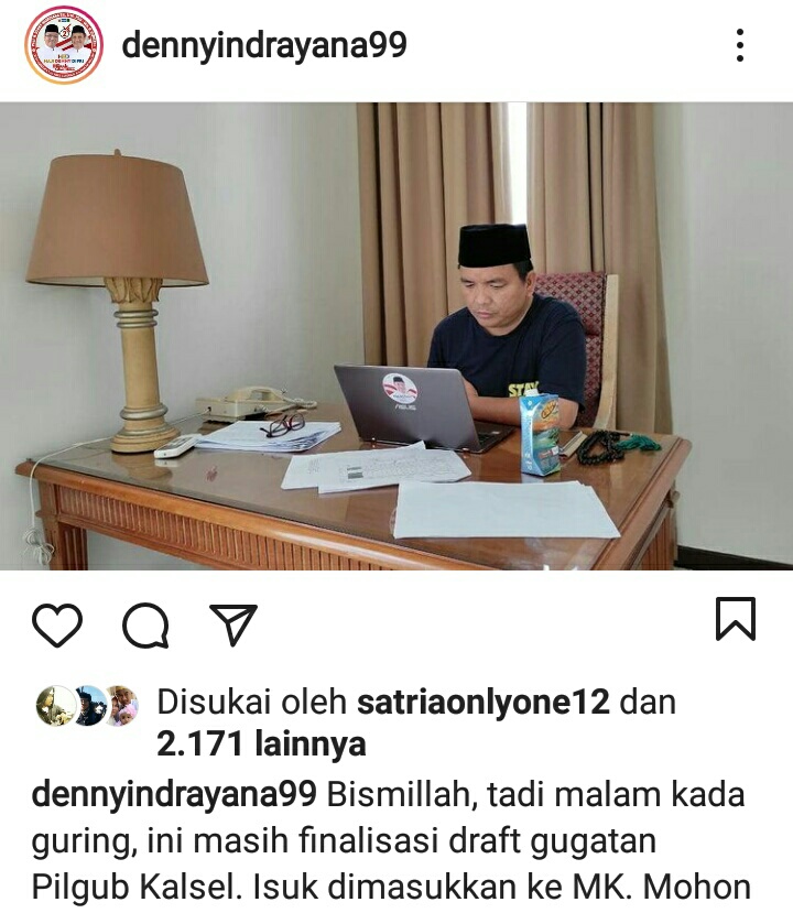 “Tadi malam kada guring (tak tidur). Ini masih finalisasi draft gugatan Pilgub Kalsel. Isuk (besok) dimasukkan ke MK (Mahkamah Konstitusi),” tulis Denny pada akun instagramnya, Senin (21/12/2020) pagi.