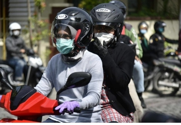 Sambil duduk di boncengan motor listrik dengan megaphone di tangan, Walikota Risma memastikan langsung kepatuhan warga Kota Surabaya dalam menaati protokol kesehatan.