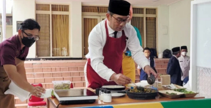BANDUNG–Gubernur Jawa Barat M Ridwan Kamil tampil memasak jengkol resep Bung Karno dalam Peringatan Hari Ibu ke-93 Tingkat Jawa Barat 2021 di Jalan Soekarno Hatta, Bandung, Rabu.