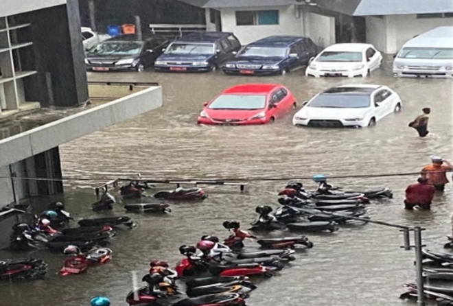 Puluhan motor dan mobil yang patkir tsk ayal terendam genangan yang terus mengalir. Beberapa terlihat berusaha menyelamatkan kendaraan mereka ke tempat lebih tinggi.