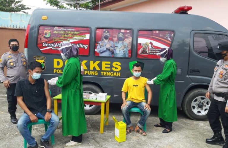 LAMPUNG TENGAH–Dalam rangka percepatan vaksinasi di Kabupaten Lampung Tengah, Kamis (22/7/2021), Gerai Vaksinasi Covid-19 Keliling Polres Lampung Tengah mengunjungi dua tempat.