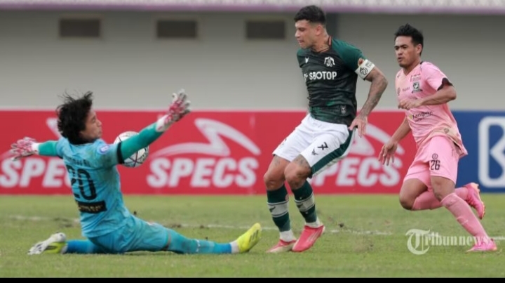 Dimas dengan tenang menendang bola hasil operan Roni Sugeng ke pojok kiri bawah kiper Barito Putera, Adhitya Harlan.