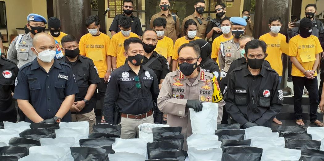 Dalam kasus ini, polisi berhasil mengamankan barang bukti tembakau sintetis seberat 150 kilogram dalam kemasan siap edar.