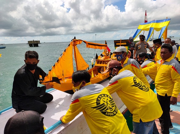 TANJUNG REDEB – Berharap bisa mengusir bencana dan penyakit, warga Suku Bajau menggelar tradisi Tradisi Mag’ Jamu, Minggu (22/11/2020). Tradisi tersebut ditandai dengan melepas miniatur perahu layar berwarna kuning ke laut lepas di Kampung Tanjung Batu, Kecamatan Pulau Derawan.