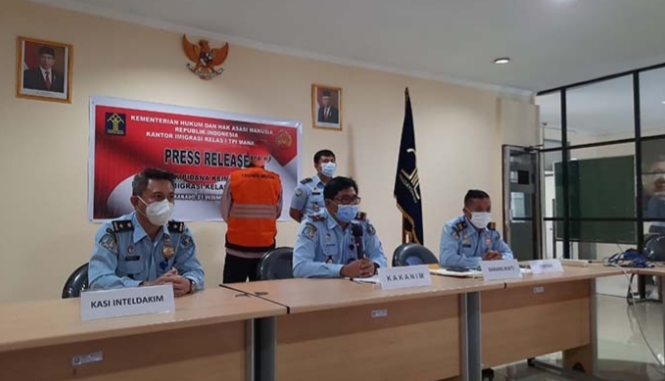 MANADO – Kepala Imigrasi TPI I Manado Arthur Mawikere, S Sos, MH menggelar konferensi pers, Senin (21/12), di Ruang Pertemuan Kantor Imigrasi di Jalan 17 Agustus, Manado, Sulawesi Utara.
