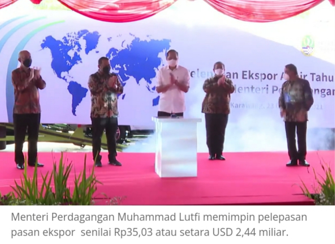 Mendag Lutfi memimpin pelepasan ekspor dalam acara “Pelepasan Ekspor Akhir Tahun 2021” yang dilaksanalam secara hibrida yang diikuti 278 eksportir dari 62 kabupaten/kota di 26 provinsi hari ini, Kamis (23/12) dengan lokus utama di PT. Toyota Motor Manufacturing Indonesia, Karawang International Industrial City, Jawa Barat.