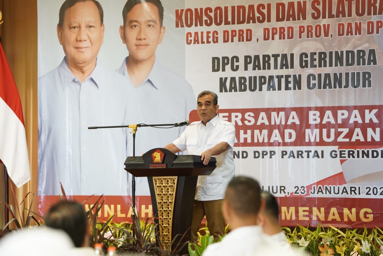 Sekjen Partai Gerindra Ahmad Muzani menghadiri konsolidasi DPC Gerindra Kabupaten Cianjur pada Selasa (23/1). Dalam rangkaiannya, Muzani meminta kader untuk berjuang memenangkan Prabowo-Gibran Gerindra di Cianjur pada Pilpres 2024 nanti.