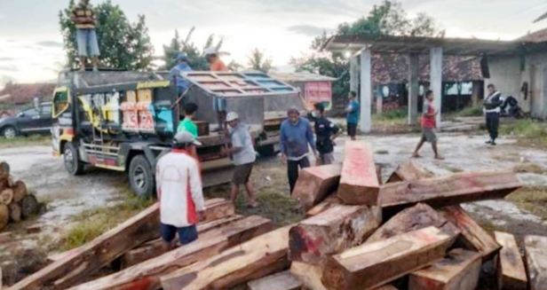 Barang bukti Kayu Sonokeling yang sudah dipotong menjadi balok kayu 2 meteran dengan diameter 15 cm s/d 30 cm. Jumlahnya ratusanbatang kayu diangkut enam dump truk.