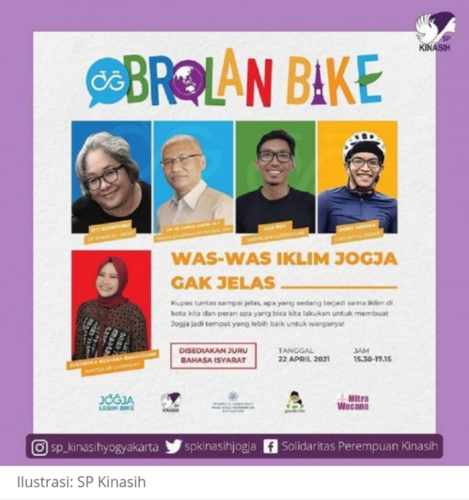 YOGYAKARTA–Bertepatan dengan peringatan Hari Bumi yang jatuh pada 22 April setiap tahunnya, Solidaritas Perempuan (SP) Kinasih, Mitra Wacana, Jaringan Gusdurian, Pusat Studi Transportasi dan Logistik (Pustral) UGM, serta Jogja Lebih Bike menginisiasi platform komunikasi Obrolan Bike. Lalu berkolaborasi menggelar diskusi yang bertema ‘Was-was Iklim Jogja Nggak Jelas’ secara virtual pada Kamis (22/4/2021).