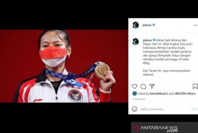 Presiden Joko Widodo mengucapkan selamat kepada atlet angkat besi putri Indonesia Windy Cantika Aisah yang meraih medali pertama bagi tim Merah Putih di Olimpiade Tokyo.