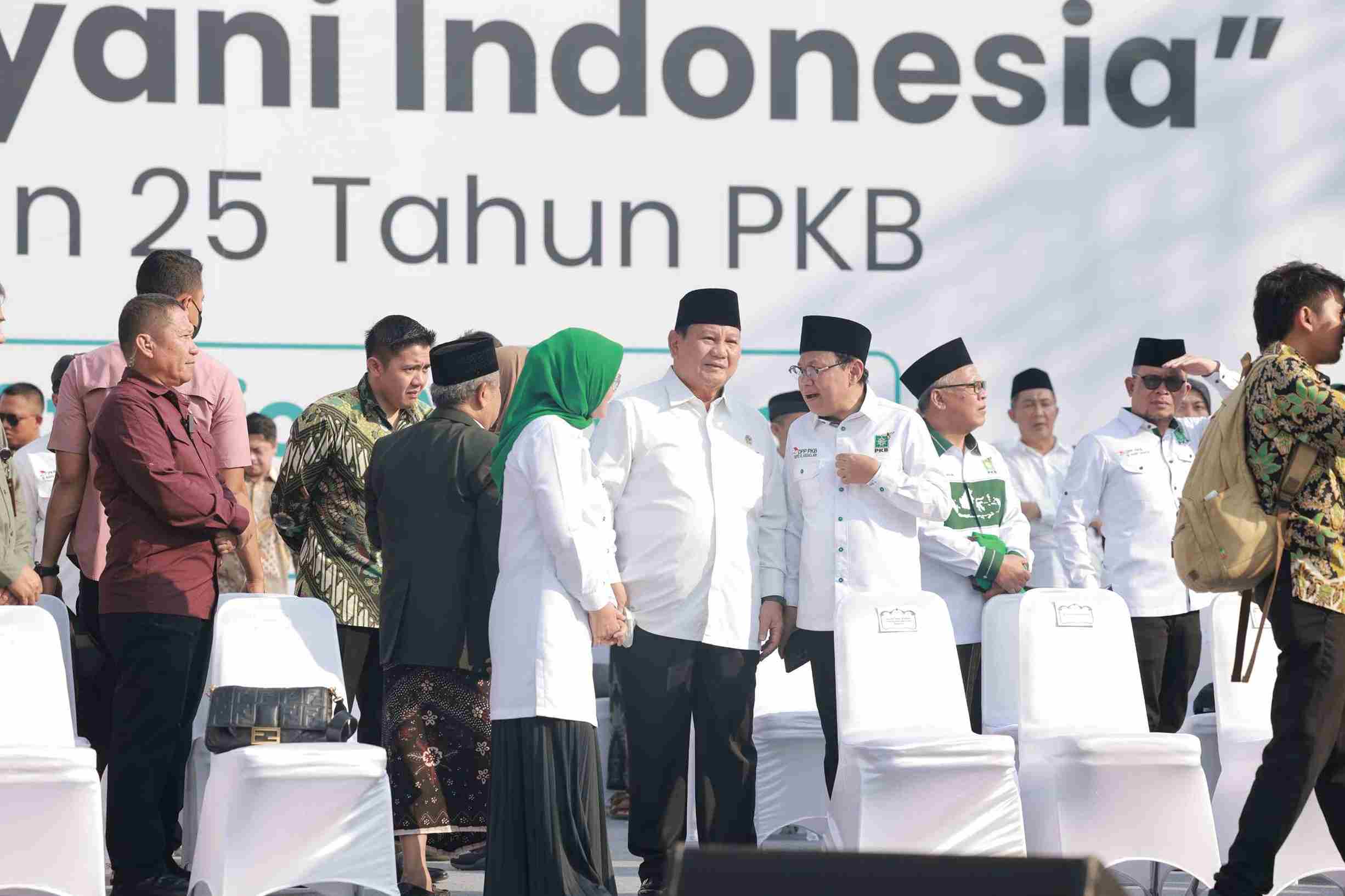 “Telah hadir bersama kita, Ketua Umum Gerindra Pak Haji Prabowo,” kata Muhaimin menerima tepuk tangan puluhan ribu kader PKB.