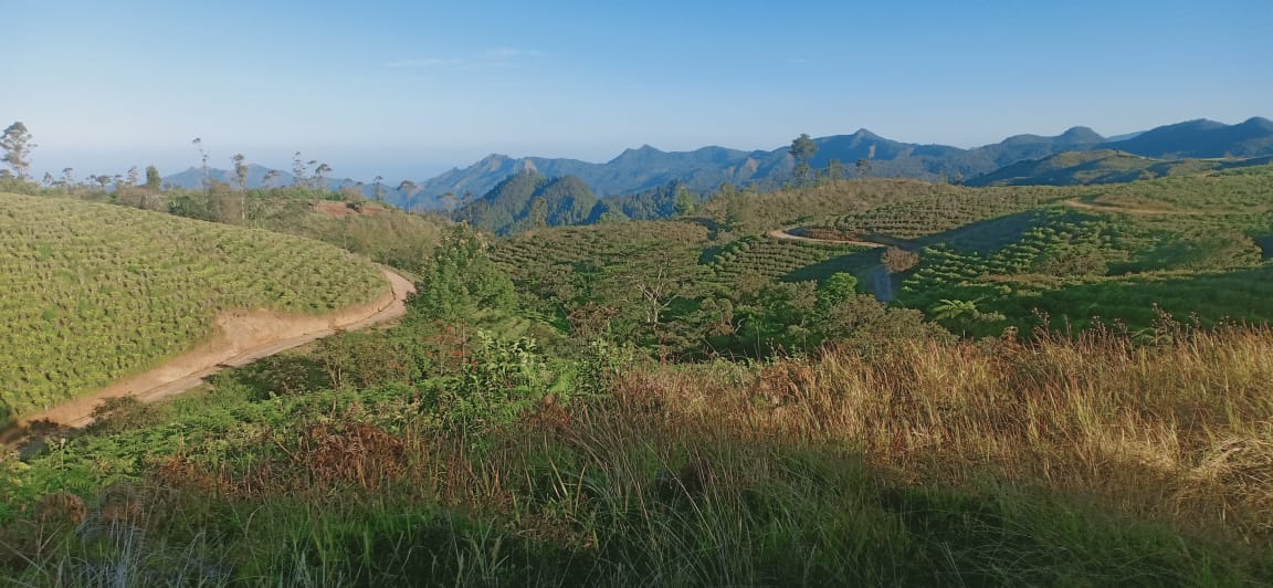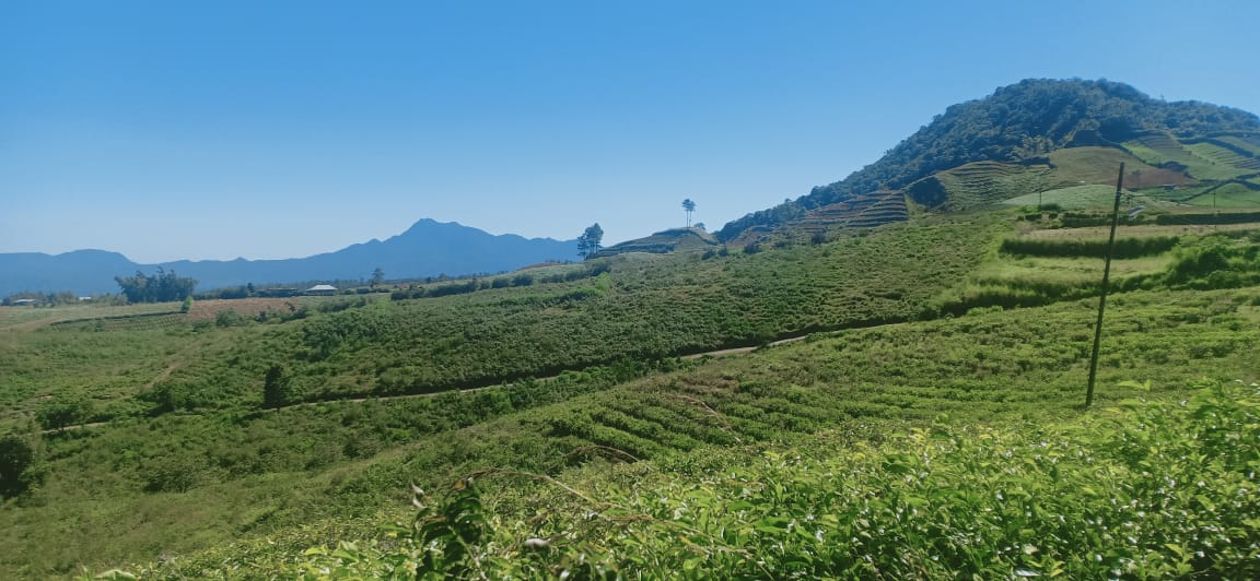 Secara instink saya duduk di teras luar. Ada banyak sekali meja dan kursi tersedia. Memandang ke bawah, kiri, kanan, tengah, tampaklah bebukitan hijau, berbaris-baris. Nuansa warna yang terlihat bergradasi, hijau hutan, hijau pepohonan, ada yang agak coklat karena kering.