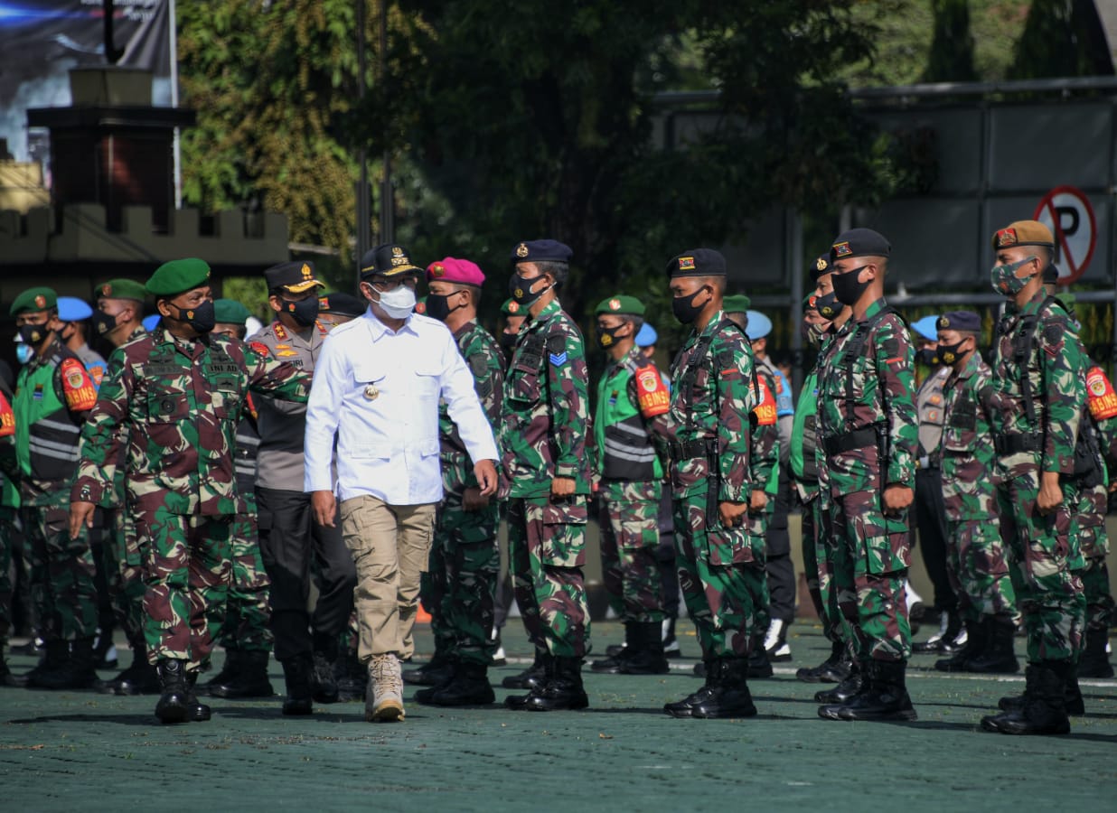 BANDUNG — Gubernur Jawa Barat Ridwan Kamil menjadi inspektur Apel Gelar Pasukan TNI-Polri dalam rangka Kesiapan Pengamanan Pilkada Serentak 2020 di Mapolda Jabar, Kota Bandung, Selasa (24/11/2020).